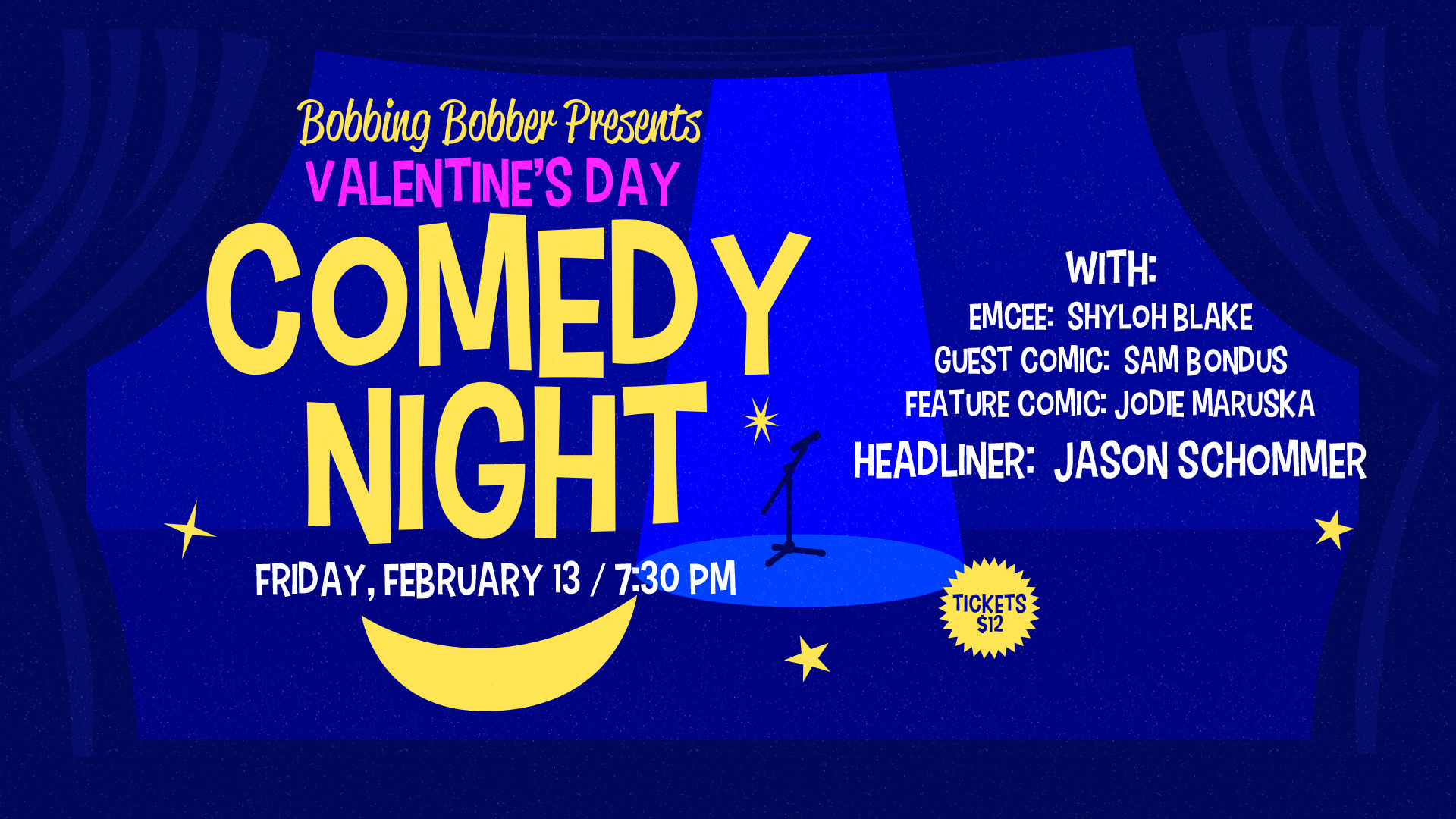 Join us here at Bobbing Bobber on Friday 02/13/25 at 7:30pm for a 90 minute comedy show with Emcee Shyloh Blake, Guest Comic Sam Bondus, Feature Comic Jodie Maruska, Headliner Jason Schommer! The perfect Valentine's night out for you and your special someone! Tickets are **WILL CALL** only and will be available in the taproom […] |